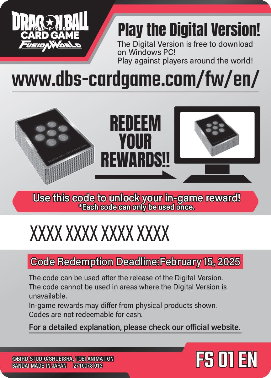 This listing is not a physical item. Please keep in mind that this Code Card listing represents a digital copy of the stated item for the Dragon Ball Super Fusion World Digital Card Game. You may receive the physical Code Card. Upon purchase, please work with your specific Seller by sending them a message using the Contact Seller button on the order details in your Order History to opt in to having your Code Card code delivered digitally due to the nature of the product.